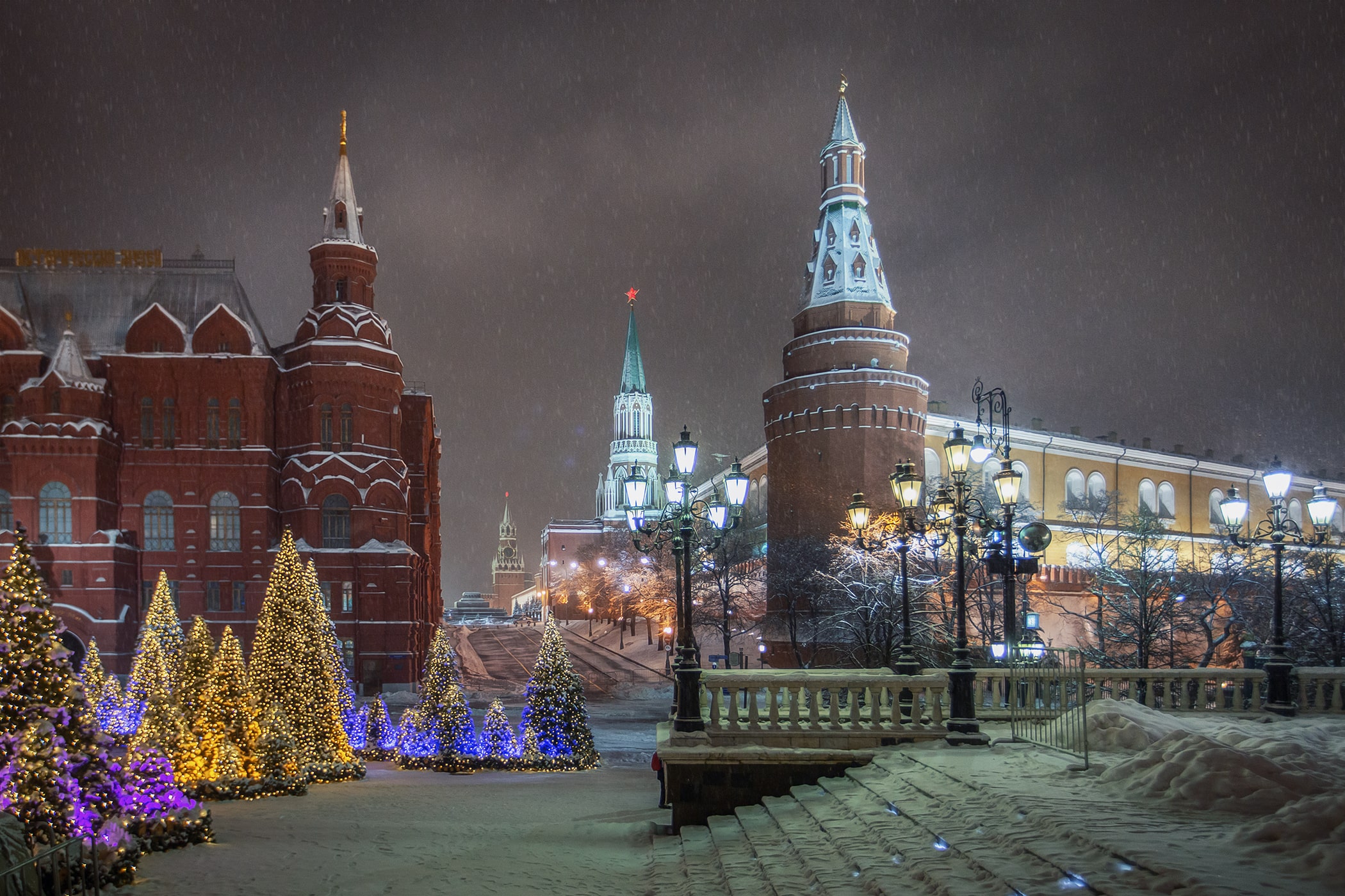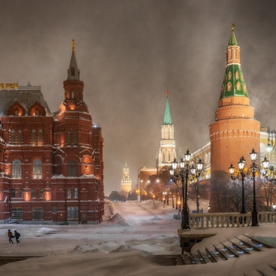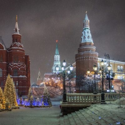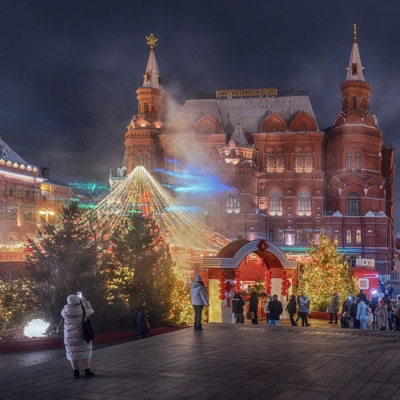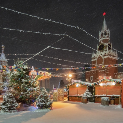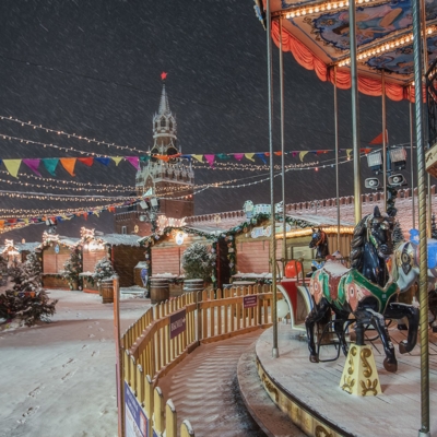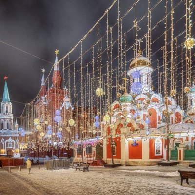 12:00 - Прогулка по Красной площади, где располагаются знаменитый каток, веселые карусели и красочная новогодняя ярмарка. Внешний осмотр Собора Василия Блаженного, ГУМа и Московского Кремля.